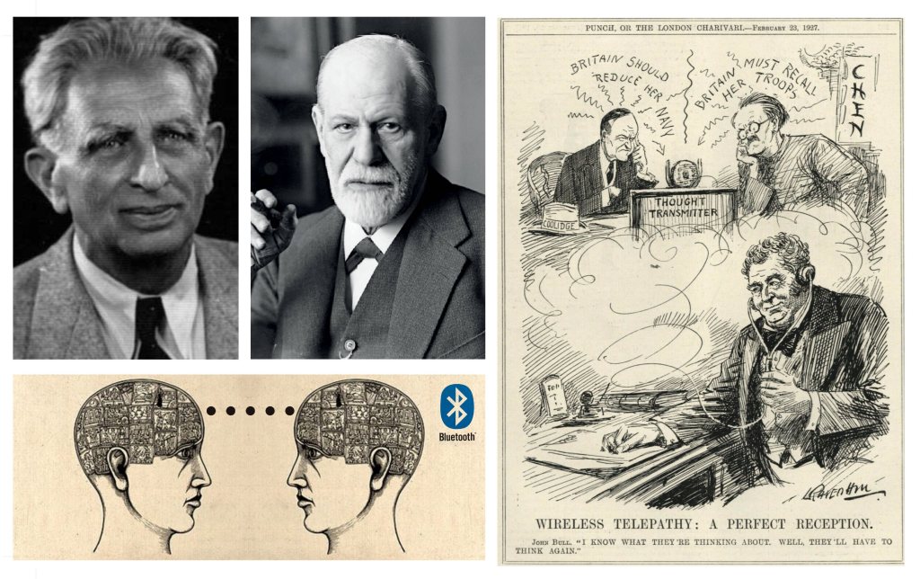 P.D. Al buscar representarse lo irrepresentable, Freud echaba mano de una metáfora telefónica para dar cuenta de la comunicación entre inconscientes, mientras que en 1927 la revista Punch (de la que Jones era un asiduo lector) presentaba un transmisor de pensamientos con la leyenda Wireless Telepathy: A Perfect Reception [Telepatía inalámbrica: una recepción perfecta]. ¿Te imaginas si Freud hubiera conocido las conexiones inalámbricas como el Bluetooth? No me cabe duda alguna de que hubiera echado mano de eso para explicarse el fenómeno. Dirás que no me lo tomo en serio, pero no es así. ¿Sabías que en 2014 un experimento español dice haber conseguido retransmitir palabras a larga distancia valiéndose de un casco transmisor de actividad cerebral por vía Bluetooth? La realidad también tiene estructura de ficción. Es justo aquí donde la paradoja derridiana podría irrumpir otra vez: la ingenuidad creería que en la era de las telecomunicaciones —que no son otra cosa mas que comunicaciones a distancia— se salvaguarda más que nunca el arribo de un mensaje a su destino, pero no se trata sino de una artimaña por un efecto de sentido: es todo lo contrario.